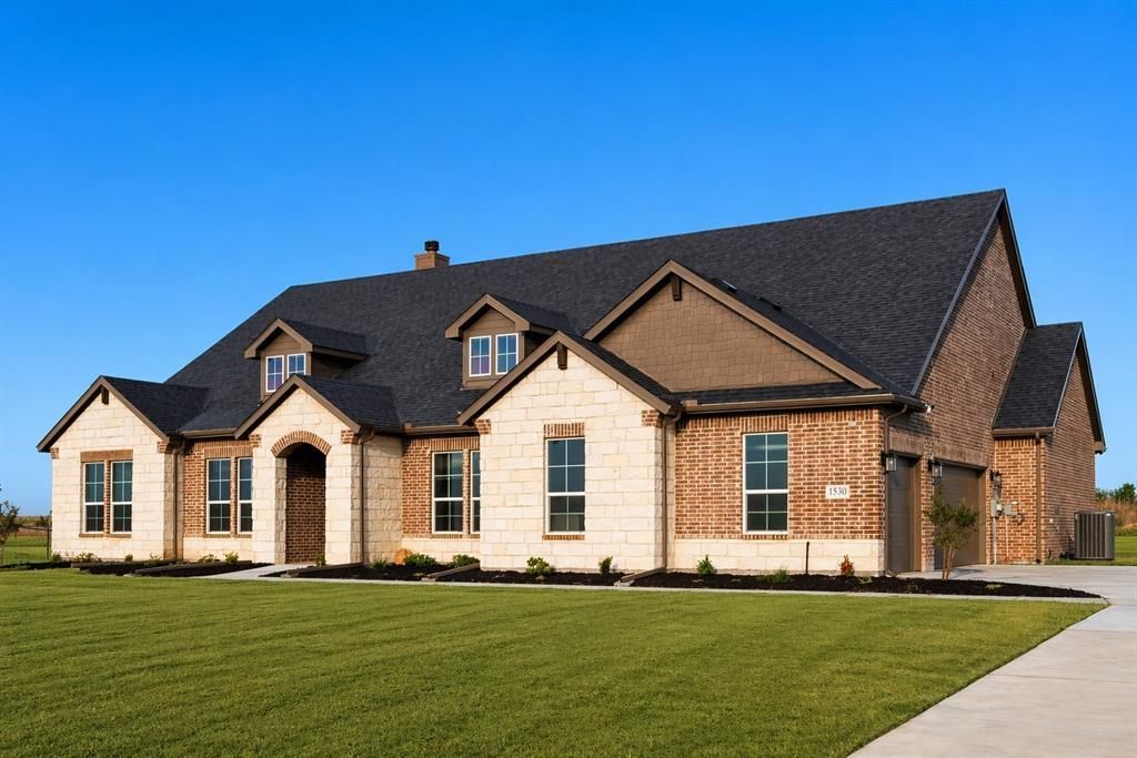 Situated on a spacious 1+ acre homesite, this thoughtfully designed home offers the perfect blend of comfort, functionality, and privacy. A charming covered front porch welcomes you into a bright foyer, where a private home office sits just off to the right—ideal for working from home.The foyer opens into a generous living area featuring a cozy corner fireplace and seamless views into the kitchen and dining spaces, creating an inviting open-concept layout. The kitchen is a true centerpiece, complete with an oversized island, walk-in pantry, and abundant cabinetry for storage.Tucked away for added privacy, the owner’s suite is located just off the breakfast nook, with convenient access to the mudroom and family entry from the 3-car garage. The spa-inspired ensuite bath features dual vanities, a soaking tub, separate shower, and a large walk-in closet.On the opposite side of the home, three well-sized secondary bedrooms share a full bath with dual sinks—perfect for family or guests. An additional flex room behind the living area offers endless possibilities as a game room, media space, or second living area, with a nearby half bath for convenience.Step outside to the expansive covered patio overlooking the beautiful backyard—ideal for relaxing or entertaining while enjoying the privacy and space of your acre-plus lot.