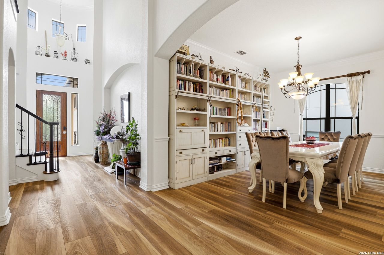 Welcome to 3023 Spider Lily in the gated Point Bluff at Rogers Ranch community. This 4-bedroom, 4.5-bath home offers over 4,000 sqft of well-designed living space with two living areas, a dedicated study, and a home theater. Stone and stucco exterior with wrought-iron detail. Inside, soaring ceilings and a stone corner fireplace anchor the main living area with expansive views of the private backyard. Updated kitchen with center island, prep sink, and granite counters. The main-level guest suite includes its own kitchenette, ideal for multi-generational living or visiting family. A 2-car garage connects directly to the hallway with direct access to the guest suite, plus an additional 1-car garage. Primary suite with separate vanities and walk-in closets, soaking tub, and walk-through shower. Upstairs features a spacious living area and media room with half bath. Gated community with pool, tennis courts, basketball court, kids playground, and newly added trail connections linking Point Bluff to the greater San Antonio trail network. Minutes from La Cantera, The Rim, and top-rated schools.